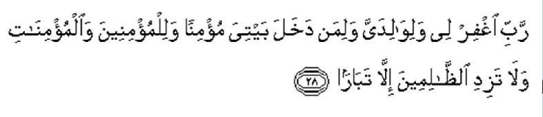 “Wahai Tuhanku! Ampunkanlah bagiku, dan bagi kedua ibu bapaku, serta bagi sesiapa yang masuk ke rumahku dengan keadaan beriman; dan (ampunkanlah) bagi sekalian orang-orang yang beriman, lelaki dan perempuan; dan janganlah Engkau tambahi orang-orang yang zalim melainkan kebinasaan!” [Nuh 71:28]