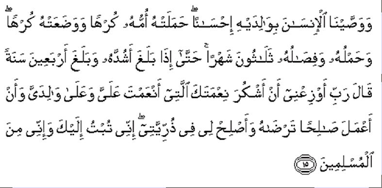 “Wahai Tuhanku, ilhamkanlah daku supaya tetap bersyukur akan nikmat-Mu yang Engkau kurniakan kepadaku dan kepada ibubapaku, dan supaya aku tetap mengerjakan amal shalih yang Engkau redhai; dan jadikanlah sifat-sifat kebaikan meresap masuk ke dalam jiwa zuriat keturunanku. Sesungguhnya aku bertaubat kepadamu, dan sesungguhnya aku dari orang-orang Islam (yang tunduk patuh kepadamu).” [al-Ahqaf 46:15]